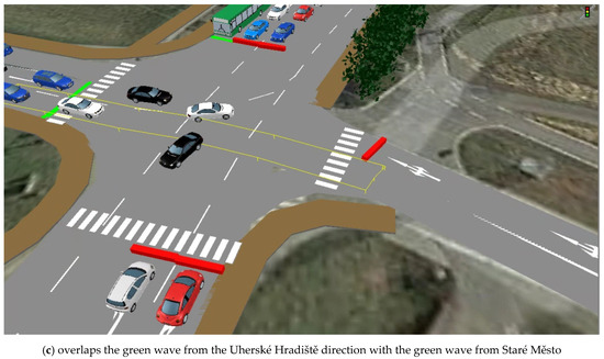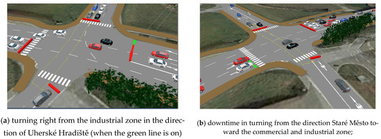 When the green light is on, it is possible to turn right from the industrial area in the direction of Uherské Hradiště. The specific layout of the intersection (Figure 6) overlaps the green wave from the Uherské Hradiště direction with the green wave from Staré Město, which results in downtime when turning from Staré Město toward the commercial and industrial zone.