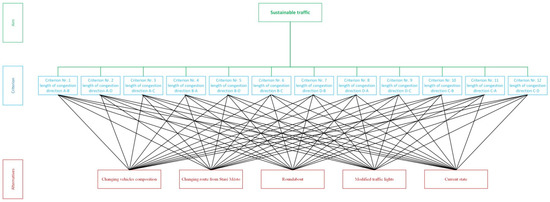 This literature review provides interesting combinations of MCDM and the simulation approach. This combination can be also used for the solution of transport sustainability and transport problems, for example, modeling and testing of different intersections using Vissim software, followed by generation of the AHP model using the PTV Vissim results or using AHP to solve traffic issues that arise due to ad hoc urban planning by changing road geometries and signaling model alternative solutions via PTV Vissim software [30,31,32]. This idea is also presented in this paper.