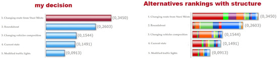 The study used values that were the result of simulation experiments. Specifically, it was the length of traffic congestion on individual traffic directions. These characterized the number of means of transport on a given track profile. As another value, the transit time of the given section was used, which was used to monitor how favorable the given transport solution was. The application of these values in the evaluation was able to compare the individual sections and remove any advantage because the section is less frequent in terms of its importance. The value of consistency ratio (CR): 0.0933. The main limit in the analysis is the capacity of the transport infrastructure. We speculated, excepting the roundabout, about the use of the existing transport infrastructure, without increasing its capacity. This solution was chosen because the extension of the road infrastructure would be quite demanding in terms of securing the available space and high investment costs.