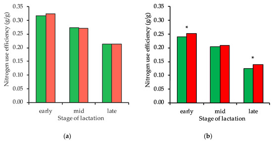 Nitrogen use efficiency in grazing dairy cows of low (green) and high (red) milk urea nitrogen breeding values (MUNBV) during early, mid, and late lactation in two grazing dairy farms of contrasting intensification: (a) High intensity and (b) low intensity. * Indicates significant differences for MUNBV (p < 0.05) within the same farm and stage of lactation: Early (days in milk (DIM) < 100), mid (100 < DIM < 200), and late (200 < DIM).