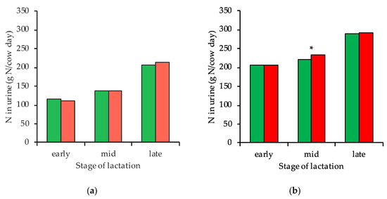 Daily urinary nitrogen (N) excreta in grazing dairy cows of low (green) and high (red) milk urea nitrogen breeding values (MUNBV) during early, mid, and late lactation in two grazing dairy farms of contrasting intensification: (a) High intensity and (b) low intensity. * Indicates significant differences for MUNBV (p < 0.05) within the same farm and stage of lactation: Early (days in milk (DIM) < 100), mid (100 < DIM < 200), and late (200 < DIM).