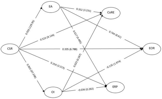 The indirect mediating effect of EA and OI between CSR and the outcome variables were also assessed and presented in Figure 1. EA significantly mediates the CSR—CoRe path (β = 0.328, t = 3.224, p < 0.05), CSR—EOR path (β = 0.694, t = 8.476, p < 0.05) and CSR—ERP path (β = 0.575, t = 4.457, p < 0.05). However, while OI significantly mediates the negative effect CSR has on EOR (β = −0.122, t = 1.967, p < 0.05); its mediation effect on the CSR—CoRe path (β = 0.021, t = 0.268, p > 0.05) and the CSR—ERP path (β = −0.032, t = 0.281, p > 0.05) are non-significant. Therefore, all direct paths hypothesized in the conceptual model are supported, with the exceptions of the path between OI and CoRe, as well as OI and ERP, while the majority of the indirect effects were significant, except for the following, CSR—OI—CoRe and CSR—OI—ERP.