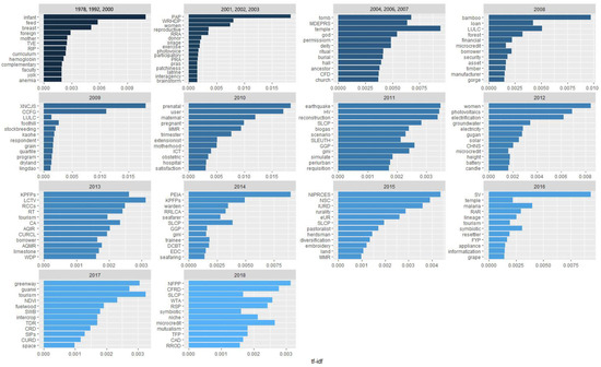 Since 2009, national ecological programs emerged as an important theme in publications. As we can see in Figure 5, “Conversion of Cropland to Forest and Grassland Program (CCFG)” and “grain” in 2009; “Sloping Land Conversion Program (SLCP)” in 2011, 2014, and 2015; “the Grain for Green Program (GGP)” in 2011; and the “Key Priority Forestry Programs (KPFPs)” in 2013 and 2014, all are important terms in the corresponding years.