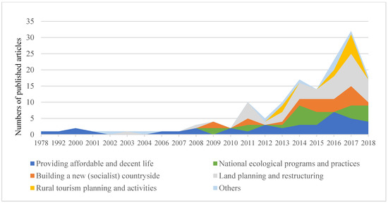 In the last decade, publications concerning rural planning in China have started to increase covering diverse themes, which could be classified along six main topics: providing affordable and decent life under industrialization and urbanization progress; national ecological programs and practices, building a new (socialist) countryside and rural−urban relationship in planning; land planning and restructuring; rural tourism planning and activities; and other themes, including women in rural planning, cultural space, and PRA. Figure 6 shows the distribution trend of the six themes. Academic research on rural planning in China was originally only focused on the theme of providing affordable and decent life under industrialization and urbanization progress. Since 2009, the themes regarding national ecological programs and building a new (socialist) countryside have become prevalent. They were followed by the theme of land planning and restructuring, which has become the most dominant research topic recently. Finally, rural tourism appeared as a new subject in the last years.
