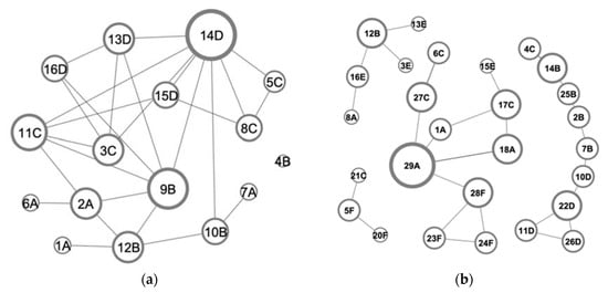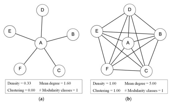 Figure 1a shows a network centralized in node A, which is the only person who connects with the other network members. This behavior is supported by an average degree of connection of 1.6 people, i.e., that on average each node connects with other 1.6 nodes of a total of 5 potential connections. Complementarily, the density of this sociogram is 0.33 (5/15), which is lower than the density of the sociogram in Figure 1b, where the actual connections are equivalent to the possible connections (15/15). Another difference between the sociogram in Figure 1a,b is the clustering coefficient; in the first one, there are no triads generated between the nodes, while in the second one, there are all the possible triads between the nodes. Therefore, the clustering coefficient in Figure 1a is 0 and that in Figure 1b is 1. Nevertheless, in both sociograms, there is only one modularity class, that is, in these two sociograms there are no sub-communities within the whole network.