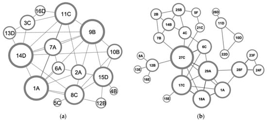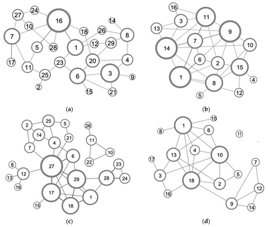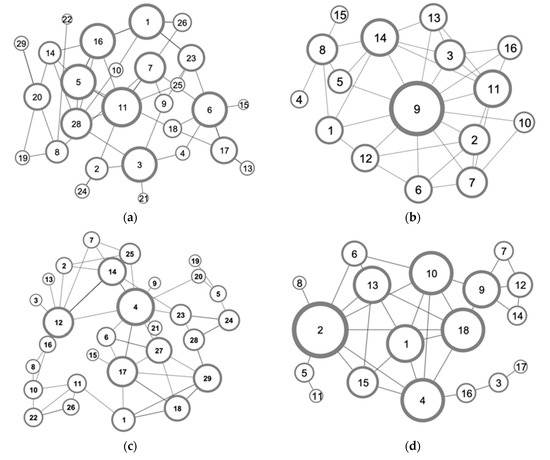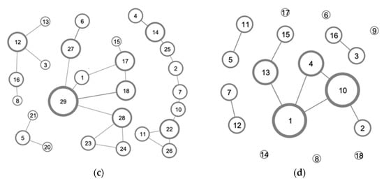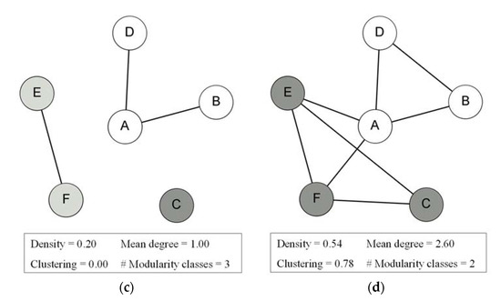 Figure 1c contains only 3 connections of the potential 15; it is the network with the lowest density and the lowest average degree of all the shown sociograms. Additionally, Figure 1c) presents three clearly disconnected sub-communities (number of modularity classes equal to three); this is remarked through the node colors. Furthermore, the clustering coefficient is zero since there is no triad in this network. It is not necessary that the sub-communities are completely disconnected to have more than one modularity class. For example, in the sociogram of Figure 1d, it is possible to visualize two modularity classes, that is, two sub-communities (gray and white nodes) are generated because there is a relatively superior connection between one group of nodes and the other. Additionally, in Figure 1d, triads can be appreciated between the nodes ABD, AEF, and EFC, thus, there is a clustering coefficient higher than the sociograms in Figure 1a,c, but lower than Figure 1b.
