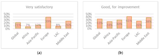 Respondents were asked about their general perceptions regarding the relevance of the national internet infrastructure (Figure 2 shows the bar charts of participants’ opinions to these aspects for six answer categories, from a=very satisfactory, to f=other). In terms of the comprehensive consultation, respondents were questioned with a focus on internet infrastructure and the situation for higher education institutions. In this sense, there was a relevant difference between Europe (39% described the internet infrastructure as satisfactory), and LAC (58% said ‘good in big cities, but poor in rural areas’). Certainly, this consideration suggests that the opportunities are not the same in terms of digital transformation (Figure 2).