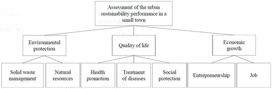 Delimiting the context and defining the actors started the construction of the PM model. The delimitation of the context lies in the fact that the city’s management does not have its own (singular) performance measurement model that allows it to manage and implement actions to improve economic, environmental, and social sustainability. Additionally, considering that the model would encompass the evaluation of multiple criteria, the information generated would support the decision by aggregating the objectives and concerns of different departments. The actors were defined as follows: Decisionmaker—mayor; Intervening parties—responsible for the Departments of Environment, Social Welfare, Health, Solid Waste and Industry and Commerce; Acted—companies and civil society, that is, those who benefit from or suffer the consequences arising from the results of measures taken by the municipal management; Facilitator—one of the authors of the research. The role of the facilitator, based on the methodology, is to coordinate the process and fully consider the aspects identified by the decisionmaker and stakeholders as relevant to the PM model. Once the specifics of the environment and the actors in the context were identified, the problem label was defined: Assessment of the urban sustainability performance in a small town.