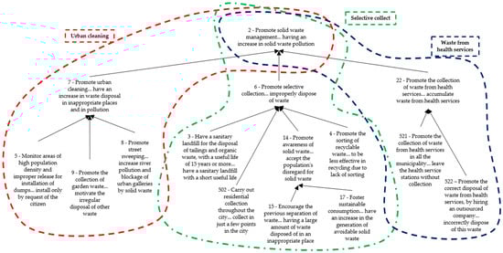 Solid waste management, in addition to being considered for evaluating the urban sustainability management of the context, has been addressed in several studies, which demonstrates the importance of its evaluation. However, it is clear that the authors have different views about the metrics and factors to be evaluated. The most prominent criterion in the literature refers to the production of waste [7,9,10], although other factors are also highlighted, such as waste collection and treatment methods [33], waste sent to landfill [7,22], and urban cleaning [15]. The existence of similarities between the evaluation criteria present in the model and in the literature was noticed, although the measurement of waste production was not considered by the actors.