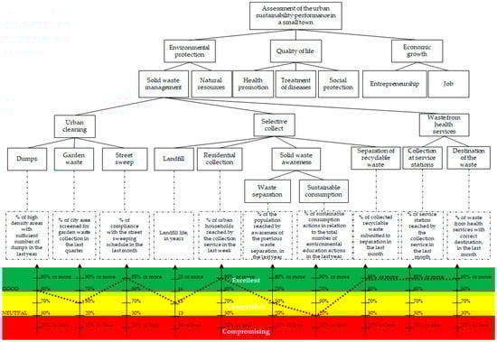 In the hierarchical structure of value, the most operational elements were at the base, called elementary points of view (EPsV). The FPsV “Solid Waste Management”, for example, was answered by the EPsV “Urban cleaning”, “Selective collection”, and “Waste from health services”. Therefore, the EPsV “Urban Cleaning” was answered by dumps, garden waste collection, and street sweeping, which referred to more operational objectives. The same process was carried out with the other FPsV.