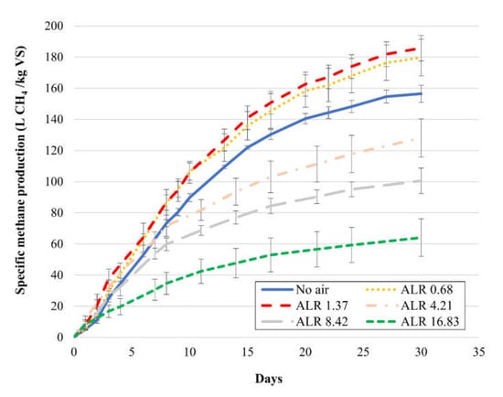From day 8, SMP cumulative curves started to diverge sensibly, indicating that some of the metabolic pathways involved in the anaerobic degradation were inhibited by the higher doses of air injected into the reactors. The observed trend suggests the existence of an oxygen concentration threshold in the reactors above which the overall performance is significantly lower. Once the threshold level was reached, methane production decreased with the increase in the amount of air (and hence of oxygen) added to the system. In other words, above this threshold, the more air dosed to the system, the less methane produced. The inhibitory threshold was reached at ALRs exceeding 1.37 L air/kg VSin d (Figure 2), which was the dose corresponding to the highest SMP observed. In contrast, the presence of controlled oxygen amounts at low ALRs (0.68 and 1.37 L air/kg VSin d) increased methane production. No significant difference was observed between the SMP values obtained at these ALRs (Figure 1).