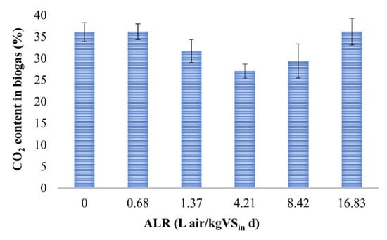 The average values of the CO2 content in the biogas ranged between 27% and 36% (Figure 3). The CO2 content was similar at ALRs of 0 (no aeration) and 0.68 L air/kg VSin d, i.e. around 35%, being similar to the typical values obtained in the biogas from AD of SS []. This indicates that microaeration at the lowest air doses did not considerably affect the biogas composition.