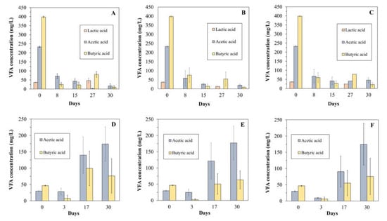 Figure 4D–F shows that the accumulation of acetic and butyric acid started from day 17, reaching a concentration of around 175 mg/L in all reactors. The observed VFA accumulation at high ALRs highlighted some unbalances due the oxygen excess in the AD process, which hindered and slowed down the complete conversion of VFA to methane. Indeed, no accumulation was observed at low ALRs, in agreement with the higher methane yields obtained (Figure 2). The VFA accumulation observed at high ALRs was likely the result of a dynamic equilibrium in which a fraction of the accumulated VFA was degraded by aerobic facultative consortia [], rather than being converted to methane or accumulated into the reactor at higher concentrations. As a result, the concentrations of acetic and butyric acids were well below the inhibitory levels of these VFA for AD (>2.5 g/L) []. This indicates that microaeration could help with controlling VFA concentrations in the digester, even under unbalanced conditions, where VFA accumulation often results in the interruption of methane production.