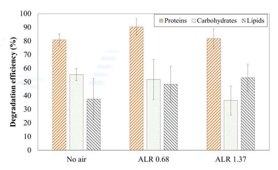 Microaerobic conditions also displayed some influence on the macronutrient composition of the SS digestate. Figure 5 reports the degradation efficiencies of the proteins, carbohydrates, and lipids at the end of the tests carried out with low air doses (ALR = 0–1.37 L air/kg VSin d). The concentrations of macronutrients in the digestate were significantly lower compared to those in the raw sludge. In particular, the degradation of proteins was the most significative (81–90%), followed by carbohydrates (36–55%) and lipids (37–53%). Interestingly, an increase in the air dose resulted in an increasing trend in the degradation of lipids. This suggests that the presence of O2 promoted the β-oxidation of long chain fatty acids (LCFA). Duarte et al. [] observed that microaerobic conditions play a primary role in allowing the conversion of recalcitrant LCFA to methane by means of facultative anaerobic consortia.