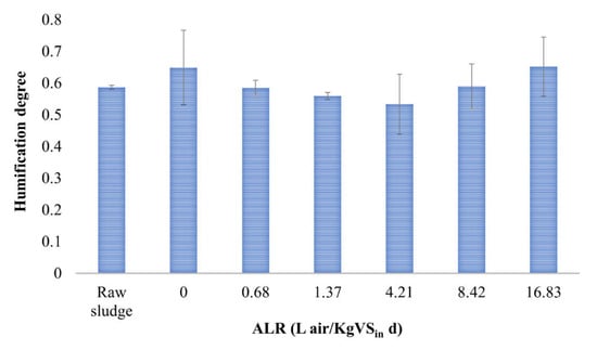 Several differences were observed in the evolution of HS at different ALRs. Figure 6 shows the HD values calculated in each of the tested conditions. Overall, AD did not result in a decrease of HD, mainly due to an average reduction of TEC by approximately 40%. However, it can be observed that applying a low ALR reduced the HD of the digestate, which remained <0.6. This is consistent with the higher SMP observed, as a bigger portion of OM was likely driven towards methane rather than HS. An increase in air dosing led to increasing the HD, which reached (ALR = 8.42) and finally overcame (ALR = 16.83) the HD value obtained in the bioreactor with no aeration (Figure 6), as the presence of oxygen probably contributed to enhance carbon sequestration in HS, subtracting it from the biomethanation process. Low oxygen dosage indeed allowed for a better conversion of HS in the reactors, contributing at least in part to enhancing the final methane yield.