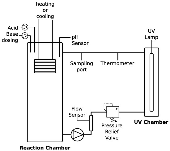 To test the effectiveness of an intensity UV source higher than the intensity of natural UV and the impact of hydrogen peroxide (30% w/w in H2O; Sigma-Aldrich, St. Louis, MO, USA), a 3.3 L automated UV-based cyanide-destruction batch reactor was constructed (Figure 1). A residential UV lamp was chosen because it is an off-the-shelf item that can be easily obtained in Peru by local vendors, in addition to the fact that it is powerful enough to activate hydroxyl radicals [21]. The UV lamp emits at 254 nm with an energy density of 40 mJ/cm2 measured by the manufacturer at a flow rate of 8.3 LPM (Lumenor, Guelph, ON, Canada) and a working volume of 1.2 L. The power density, which is independent of the flowrate, can be calculated based on the energy density measured at a given flowrate. For example, at a flowrate of 8.3 LPM and a lamp’s working volume of 1.2 L, the residence time in the device is 7.9 s. Dividing the reported energy density by the residence time yields a 4.6 mW/cm2 energy density.