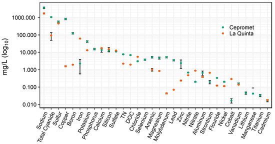 Water quality characterization of the two gold-processing sites in the Arequipa region. La Quinta represents a remote mine site that treats ore from a single source, whereas Cepromet is a centralized facility that processes ore from a variety of sources. Analytes are ordered from highest concentration to lowest on a log10 scale. Error bars represent standard deviation.