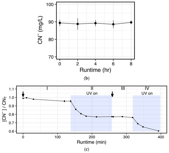 The effects of peroxide without and with UV on cyanide destruction was tested for an initial concentration of ~100 mg/L CN−. The experimental results are characterized by “Phase”, based on reactant condition and time (Figure 3c). The experiment tested the effects of peroxide alone and peroxide with UV on cyanide destruction. Hydrogen peroxide was dosed at a 1:0.1 stoichiometric ratio (cyanide to peroxide), at the beginning of the experiment, with a circulation rate of 1 L/min to provide mixing. Percent decreases in cyanide concentration are expressed as a percent of initial values. In Phase I, the reactor mixed for 140 min with cyanide and peroxide and with the UV lamp turned off, observing a 4% decrease in cyanide concentration. The high-intensity UV lamp was turned on at 140 min for 120 min (Phase II). The combination of peroxide and UV resulted in an initial 18.3% decrease in cyanide concentration.