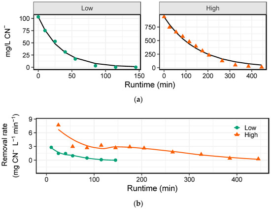 (a) Cyanide destruction at two initial concentrations (Low = 100 mg/L CN− & High = 1 g/L CN−) with 1:1 stoichiometric ratio of initial cyanide to hydrogen peroxide. Black curve indicates the model fit and dots indicate the mean of measured time-points. (b) Cyanide removal rate over time for low and high cyanide concentrations. Smoothed curves indicate a locally weighted regression and ribbons represent standard errors.