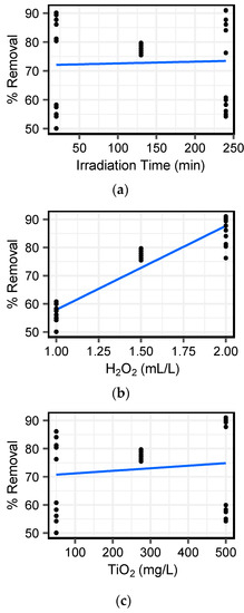 Linear regression for main variables (a) irradiation time, (b) peroxide concentration (3%), and (c) TiO2 concentration, on free cyanide removal (%).