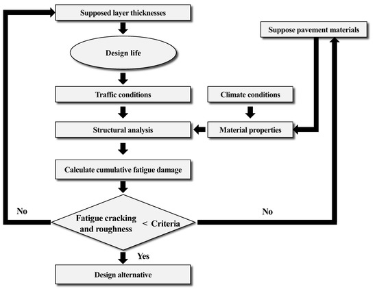 The BCO pavement needs to deliver the same performance as that of new jointed concrete pavement. The required slab thickness for new pavement was determined using the Korean pavement design method—a mechanistic–empirical design method—according to the traffic volume of 67 regions with the worst climatic conditions in Korea. This was the first step toward the development of a design catalog for BCO pavements. The Korean pavement design program was developed as an output of the Korean Pavement Research Program [7], which was conducted between 2000 and 2011. The new jointed concrete pavement was designed according to the procedure shown in Figure 2. The unique Korean climate, material, and traffic conditions were used as the key input variables of the design program.