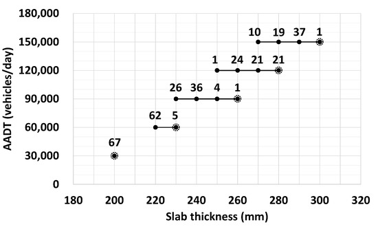 Figure 4 illustrates the slab thickness distribution of the new pavement designed according to the climatic conditions and traffic volumes of the 67 regions for a lifespan of 20 years. The slab thickness was designed to be 200 mm for an AADT of 30,000 vehicles/day, regardless of regional climatic conditions. However, a variation of 10 mm in slab thickness occurred for an AADT of 60,000 vehicles/day due to differences in the regional climatic conditions. In addition, a variation of 30 mm occurred for an AADT from 90,000 to 150,000 vehicles/day. For a conservative design, the largest thickness according to the climatic conditions was used as the design slab thickness for a particular traffic volume.