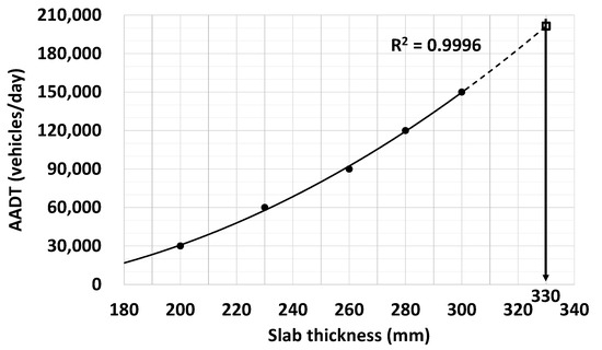 The AADT of an entire expressway section, primarily composed of jointed concrete pavement, was investigated using the 2018 Yearbook of Road Traffic Volume [10] to verify the actual traffic volume range. The average AADT of the sections was estimated to be 54,581 vehicles/day, with the AADT of the southern section of the Seoul ring expressway (Route 100) being the largest, with 183,664 vehicles/day. Therefore, as shown in Figure 5, the relationship between the AADT and slab thickness of the new pavement, which was initially determined for the AADT from 30,000 to 150,000 vehicles/day, was extended to an AADT of 200,000 vehicles/day. Consequently, slab thicknesses of 320 and 330 mm were predicted for AADTs of 180,000 and 200,000 vehicles/day, respectively.