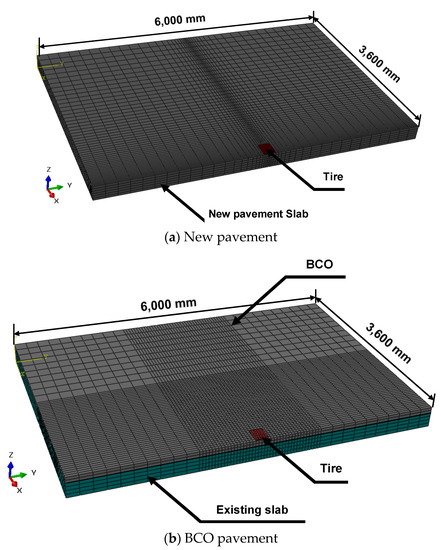 Finite element (FE) models were developed to simulate the newly jointed concrete and BCO pavements using an FEA program, ABAQUS, as illustrated in Figure 6. The structural shape of the pavements conformed to the drawings of the jointed concrete pavement included in standard drawings for expressway construction [11]. A joint spacing of 6 m, which is the most frequently used in Korea, was used in the modeling [12]. A tire loading of 80 kN was applied on the middle edge of the longitudinal joint to obtain the maximum tensile stress developed at the bottom of the slab immediately below the tire loading [13].