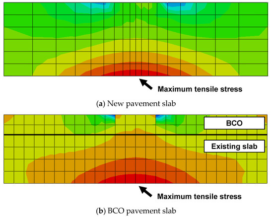 Comparison of stress distributions in slabs: (a) new pavement slab and (b) BCO pavement slab.