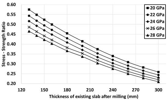 Stress–strength ratio of the existing slab according to its thickness after milling (e.g., BCO thickness of 100 mm).