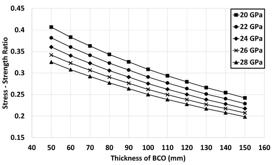 Figure 9 presents the stress–strength ratios at the bottom of the existing slab of the BCO pavement according to the elastic modulus and thickness of the existing slab after milling (e.g., for a BCO thickness of 100 mm). The stress–strength ratios of the existing slab decreased with an increase in the elastic modulus and thickness after milling. Furthermore, the stress–strength ratios decreased as the elastic modulus increased because the increased elastic modulus caused a greater increase in strength than in stress. When the slab thickness of the new pavement was designed to be 200 mm, the stress–strength ratio of the slab was 0.512, as shown in Figure 8. In this case, the stress–strength ratio of the existing slab of the BCO pavement exceeded that of the new pavement slab, as illustrated in Figure 9. This result did not satisfy the condition in Figure 1b, if the BCO thickness was designed to be 100 mm using an elastic modulus less than 24 GPa and a thickness of the existing slab less than 160 mm after milling. In this case, the stress–strength ratio of the existing slab of the BCO pavement must be decreased below that of the new pavement by increasing the BCO thickness.
