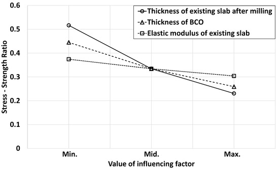 The sensitivity of the stress-strength ratio to the thickness of the existing slab after milling, the thickness of the BCO, and the elastic modulus of the existing slab were analyzed. The minimum, medium, and maximum values of the influencing factors that were already used in the FEA are listed in Table 2. The stress–strength ratio was the most affected by the thickness of the existing slab after milling, showing a decrease of 0.286 when changing the influencing factor from its minimum to maximum value, as shown in Figure 11. Varying the thickness of the BCO and elastic modulus of the existing slab decreased the stress–strength ratio by 0.186 and 0.070, respectively.
