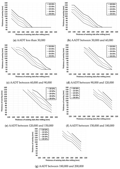 The thickness of the new pavement slab was determined for an AADT of between 30,000 and 200,000 vehicles/day using the Korean pavement design method, as illustrated in Figure 5. In addition, the thickness of the new pavement slab was determined according to the traffic volume of the region with the worst climatic conditions in Korea, as illustrated in Figure 4. The thickness of the BCO with the same stress–strength ratio for the existing slab as that of the new pavement slab was obtained according to the traffic volume range by changing the elastic modulus of the existing slab from 20 to 28 GPa and the thickness of the existing slab after milling from 130 to 300 mm, as illustrated in Table 3. The thickness of the BCO was determined to be 50–150 mm.
