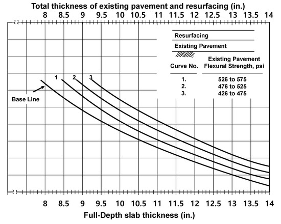 The design catalog developed in this study can be used by simply considering the traffic volume without designing a new pavement. However, to use the PCA chart, the new pavement should be designed prior to the design of the BCO pavement. In the PCA, a chart (Figure 13) is provided to design the thickness of the BCO pavement slab according to the flexural strength of the existing pavement slab [18]. To design the BCO thickness, a line is first drawn upward from the full-depth slab thickness, which is the design thickness of the new pavement slab to the base line. The line is extended in the direction parallel to the base line to meet a curve representing the flexural strength of the existing slab. The line is then extended in the upward direction again from the curve to determine the total thickness of the existing pavement resurfacing, which represents the total thickness of the existing slab after milling and overlay. The BCO thickness is determined by subtracting the thickness of the existing slab from the total thickness.