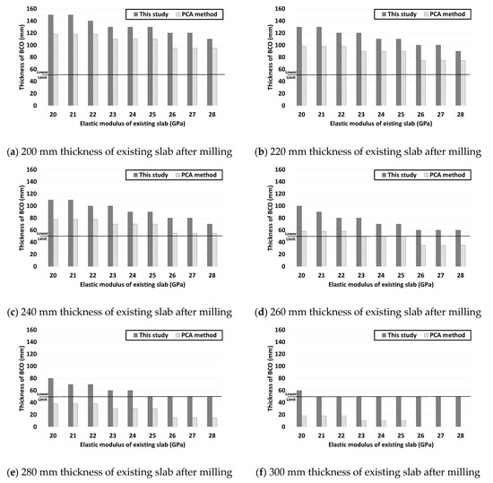 Comparison of BCO thicknesses between this study and the PCA (e.g., 280 mm thickness of new pavement slab), (a) 200 mm thickness of existing slab after milling, (b) 220 mm thickness of existing slab after milling, (c) 240 mm thickness of existing slab after milling, (d) 260 mm thickness of existing slab after milling, (e) 280 mm thickness of existing slab after milling and (f) 300 mm thickness of existing slab after milling.