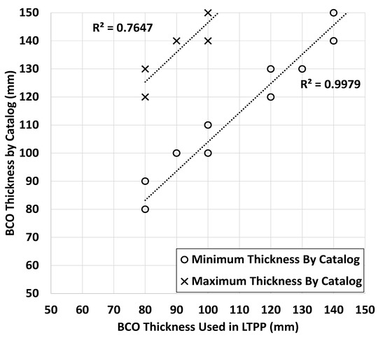 The correlation between the BCO thickness designed using the catalog and that used for LTPP sections was examined, as shown in Figure 15. Thicknesses greater than 150 mm were excluded because the maximum thickness of the BCO suggested by this study was 150 mm. All the differences between the minimum BCO thickness designed using the catalog and the BCO thickness used for LTPP sections were a maximum of 10 mm, showing a high coefficient of determination of 0.9979. The differences between the maximum BCO thickness designed using the catalog and the BCO thickness used for LTPP sections were a maximum of 50 mm, showing a coefficient of determination of 0.7647.