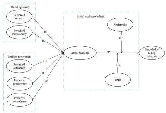First, we examine threat appraisal and intrinsic motivation within the OKC. To begin with, we consider the potential individuals’ threat appraisal of knowledge sharing based on PMT []. PMT was initially created to help us grasp individuals’ reactions to fear appeals and has been adopted to explain individuals’ security or privacy protection in previous studies [,]. Thus, we propose that knowledge hiding is considered a user’s self-protection behavior in OKCs. Determinants such as perceived severity and perceived vulnerability are proposed to negatively affect interdependence within OKCs. Second, we also employ SDT for this study. SDT demonstrates a comprehensive framework for the research of individuals’ motivation. Specifically, SDT considers how social and cultural factors influence people’s feelings of volition and initiative, overall well-being, and the quality of their performance [,]. SDT in previous studies has been designed to address the innate human need for feeling competent, related, or autonomous of a specific behavior [,]. This study proposes intrinsic motivations such as perceived autonomy, perceived competence, and perceived relatedness to foster interdependence within OKCs. Finally, we identify that social exchange beliefs such as trust and reciprocity occur among exchanges of OKC users. Intensive interpersonal communications and exchanges involved in OKCs can be interpreted by social exchange beliefs []. In addition, this study assumes that trust and reciprocity moderate the relationship between interdependence and knowledge hiding intentions.