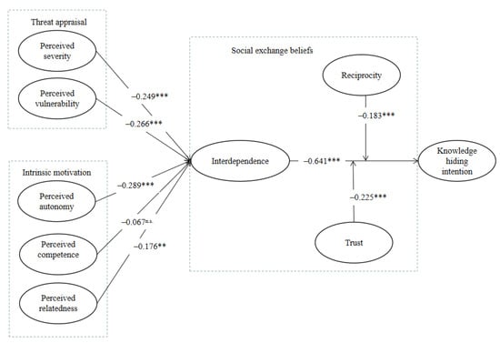 Consequently, the increased perceived relatedness with personal knowledge will lead to a lower degree of dependence on others for benefits in the OKC. In other words, interdependence will be reduced []. Individuals who highly perceive interconnectedness with their knowledge may hide valuable knowledge and be less likely to depend on others to obtain their knowledge. Until now, few studies used SDT to explore knowledge hiding [,]. They investigated the role of motivation for knowledge sharing or hiding behavior and pointed out that both were differentially motivated. Based on previous studies, we argue that perceived relatedness to individuals’ knowledge is derived from the desire to protect their knowledge and is typically manifested through reduced interdependence with other members of the OKC. Accordingly, we hypothesize: