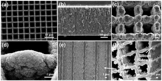 SEM images: (a) top surface of the ordered Si-MCP; (b) sidewall of Si-MCPs; (c,d) top surface of nano-Ni covered OMEP with different magnification; (e,f) sidewall of OMEP with different magnification.