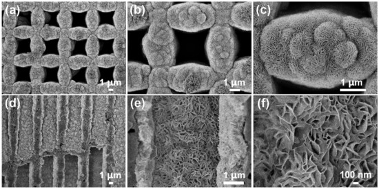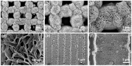 SEM images: (a–d) top surface of MnCo2O4/OMEP with different magnification; (e,f) sidewall of MnCo2O4/OMEP with different magnification.