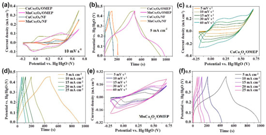 Figure 5 illustrates the CV and GCD results of electrodes based on CuCo2O4 and MnCo2O4. Figure 5a shows that CuCo2O4/OMEP and MnCo2O4/OMEP have a much better capacitance than CuCo2O4 and MnCo2O4 prepared on nickel foam. Correspondingly, the sample based on OMEP has a larger CV disclose area (Figure 5a, 10 mV s−1 scan rate) and longer discharge time (Figure 5b, 5 mA cm−2 current density). As shown in Figure 5c, the CV curve of the CuCo2O4/OMEP electrode presents a rectangle, and the CV curve gradually increases with the increase in scanning speed. Figure 5d depicts the GCD curve of the CuCo2O4/OMEP electrode. In the discharge process, the voltage and current of the CuCo2O4/OMEP electrode are linear.