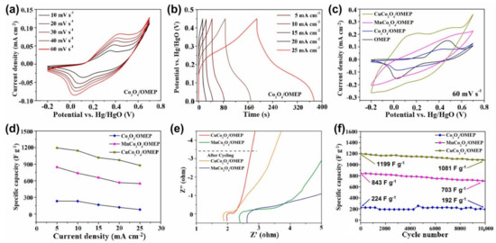 To further analyze the positive influence of the fabrication nanomaterials on OMEP and preparation of bimetallic oxides on the performance of supercapacitors, systematic electrochemical tests were also carried out on OMEP and Co3O4/OMEP. Unlike the CV from CuCo2O4/OMEP and MnCo2O4/OMEP, as shown in Figure 6a, the CV from Co3O4/OMEP has a clear redox peak, while CuCo2O4/OMEP and MnCo2O4/OMEP are more likely to be a surface electrochemical pseudocapacitive reaction at high scanning rates. Figure 6b indicates that Co3O4/OMEP has a low specific capacity and surface capacitance because it has fewer active sites and lower conductivity. Figure 6c compares CV curves of OMEP, Co3O4/OMEP, CuCo2O4/OMEP and MnCo2O4/OMEP at different scanning speeds. The results show that the CV area of the CuCo2O4/OMEP electrode is slightly smaller than that of the MnCo2O4/OMEP electrode at low scanning speed (Figure 5a, 5 mV s−1). At the same time, the compact structure of MnCo2O4 nanosheets showed a larger surface capacitance. At high scanning speed (Figure 6c, 60 mV s−1), the CV area of the CuCo2O4/OMEP electrode is about twice that of the MnCo2O4/OMEP electrode. The reverse overrun of the CV area is attributed to the higher conductivity of CuCo2O4 nanosheets than that of MnCo2O4 nanosheets, and the CuCo2O4/OMEP composite structure is more suitable for a high CV scanning speed environment. Figure 6c discloses that the capacitance of CuCo2O4/OMEP and MnCo2O4/OMEP shows considerably larger capacitance than OMEP and Co3O4/OMEP because of the larger enclosed area in the CV curve and longer discharge time (Figure S7, 5 mA cm−2 charging–discharging current).