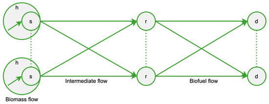 Secondly, flow equilibrium constraints are required to ensure that the flow of goods stays consistent throughout the solution. Equation (27) ensures equilibrium in every supply node between biomass flow in and intermediate flow out.
