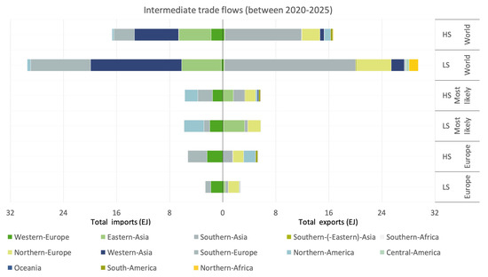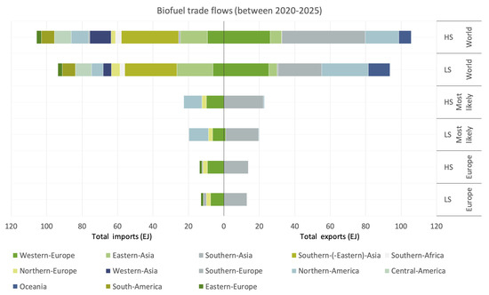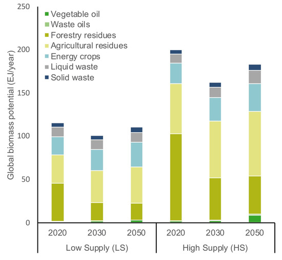 In a study by De Jong et al. [9], the amount of available biomass in the EU to supply the aviation sector was analyzed. He indicated that there is uncertainty embedded in the determination of domestic availability and import potential of biomass. To capture this uncertainty, De Jong et al. [9] developed several supply and demand scenario. Although on a broader spatial scale, this study uses a similar approach. Low Supply (LS) and High Supply (HS) scenarios are developed based on feedstock availability and competing industries. In the LS scenario, a conservative estimation of biomass availability is combined with high competition from other industries. In the HS scenario a more optimistic view on biomass availability is combined with less competition from other industries. In order to determine the amount of biomass available for the production of marine biofuels, firstly, the domestic availability of each feedstock category in each region is estimated by means of a comprehensive literature review [9,15,16,17,18,19,20]. The resulting biomass availability estimates are shown in Figure 2.