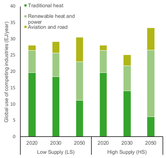 Estimated biomass use of competing industries for the two supply scenarios.