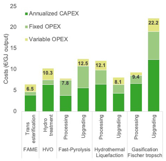 Processing and upgrading costs for different technologies. Data from [9,28,29,30,31,32,33,34,35,36,37,38,39,40,41,42,43,44,45,46,46].