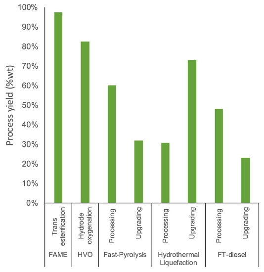 Process yields are defined as the amount of biofuel that can be produced from a certain quantity of biomass. In this case, two conversion yields are of importance: the yield from biomass to the bio-intermediate and the yield from the bio-intermediate to the biofuel end product. Conversion yields are dependent on the process conditions and the molecular composition of feedstocks. For example, grain residues have a high ash content which can reduce its conversion yield [30]. Examples of process conditions that can affect the yields are temperature, solvent-to-feedstock ratio (for fast pyrolysis) and the fluidizing medium (for GFT) [30]. In order to obtain a realistic estimation of these process yields, an average is taken from the values of different literature sources. The resulting values are visualized in Figure 6.