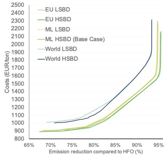 The multi-objective optimization induces a trade-off between costs and emissions. The resulting marginal costs of GHG reduction for all scenarios are visualized in Figure 7. In every run, this trade-off is reconsidered to reach the highest GHG reduction against the lowest costs. A clear trade-off between costs and emission reduction is visualized. The most beneficial trade-off is found to be around 80% GHG reduction compared to Heavy Fuel Oil (HFO), which corresponds to the average fuel costs of around 900–1050 EUR/ton of biofuel.