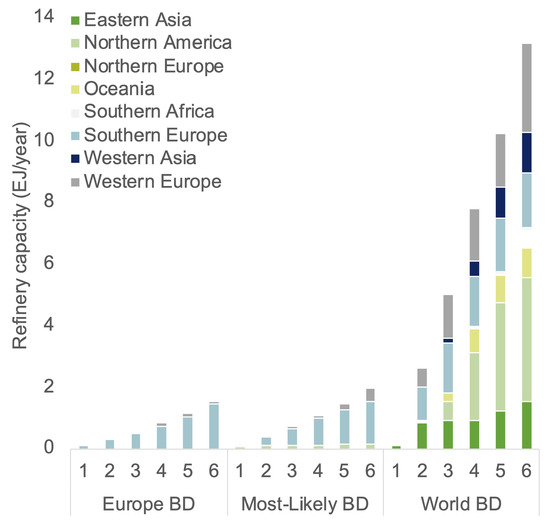Three possible future policy scenarios are developed. In the Europe scenario, it is assumed that shipping is included in the RED II and, thus, complies with these targets. In the Most-Likely (ML) scenario, leading countries in the field of sustainability are expected to comply with the RED II targets. In the World scenario, all countries are expected to comply with the IMO targets of 50% GHG reduction by 2050 compared to 2008 levels. The resulting amount of biofuel for compliance is visualized in Figure 4. Figure 4 only shows the Base Demand (BD) scenario. It can be observed from Figure 4 that compliance with the IMO targets is a significant task.
