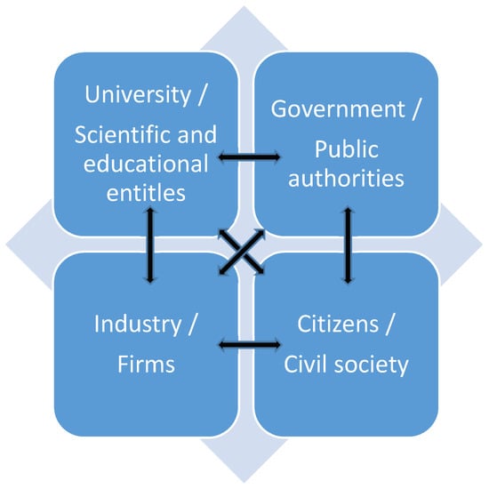 Following the Emergent perspective, a mixed research strategy, and an instrumental case study design was employed as the most suitable methodology to achieve answers to the main research question raised in this study. This design enabled us to develop certain theoretical insights and to test empirically. The research adopted the case study design in order to understand the phenomena at hand. Our paper uses the Quadruple Helix model [] to explore the strength of the relationships between social society, government, industry (business), and academia, represented by universities (academic actors) (Figure 1). This will allow us to assess the strength of the relationships between the different actors of the innovation ecosystem and, thus, determine the statistical significance of these relationships, e.g., between universities and business, to identify whether or not these relationships are well developed in the countries studied. We adapted this theoretical concept for our own case study. As Bellandi et al. [] notes, partnerships of such actors can foster social innovation and support the social commitment of each actor.
